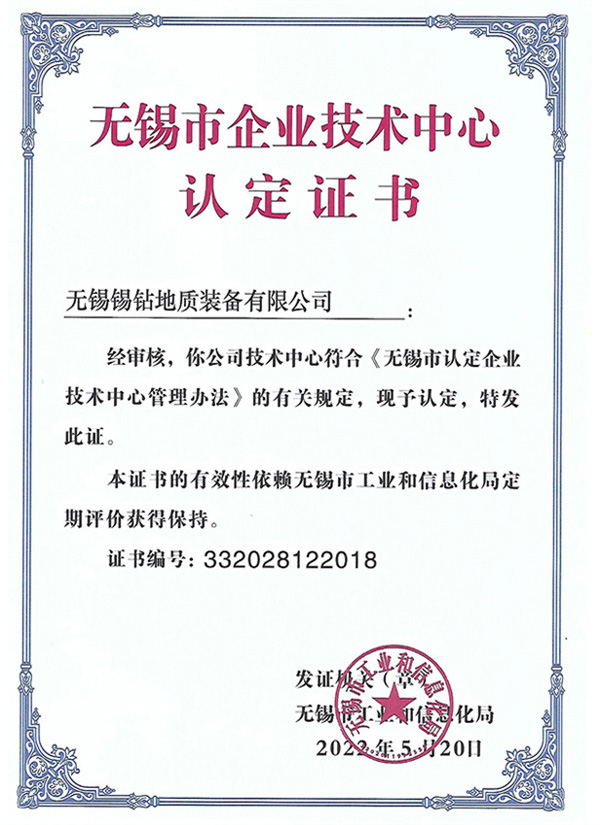 无锡市企业技术中心认定证书