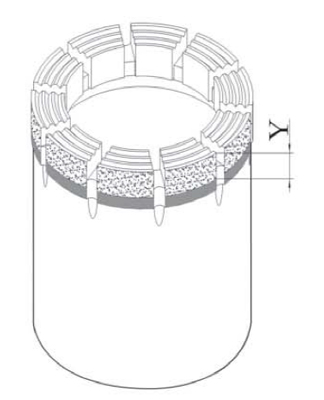 如右恻示意图所示,孕镶层高度是指钻头头部含有金刚石工作层的胎体部分的高度。 锡钻公司可以提供各种孕镶层高度的钻头,从9毫米到20毫米不等,同时客户有特殊需求我们可以根据需要设计定制孕镶层高度。 除非特别注明,公司提供钻头的标准孕镶层高度为12亳米。