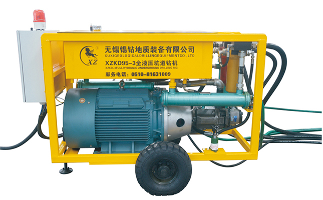 全液压坑道岩芯钻机主要部件动力车动力车装置均安装于带轮子的小车上。便于搬迁,安装 时也可以与主体机离开一定的距离。 动力车上配有大功率的电机、双联泵(主泵供给旋转装 置,辅泵供给进给油缸)、滤油器、油冷却器、手动加油泵、 电器控制箱等。